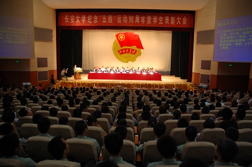 5月4日下午3时,长安大学纪念“五四”运动九十周年暨学生表彰大会在渭水校区朝晖大学生活动中心大礼堂隆重举行。校党委书记雷达、校长马建、校党委副书记杜向民、副校长刘伯权、校党委副书记董小林、王振华,副校长赵均海、谢军占、刘建朝出席会议并在主席台前排就坐。党办、校办、组织部、宣传部、学工部、团委、教务处、研究生部、科技处、公安处、学生就业与发展服务中心、渭水校区管委会办公室等部门负责人以及各院(系)党政主要负责人在主席台就座。各学院党委副书记、全体辅导员,受表彰先进集体和先进个人代表、2008级本科生代表共计1300余人参加了大会。大会由校党委副书记白华主持。