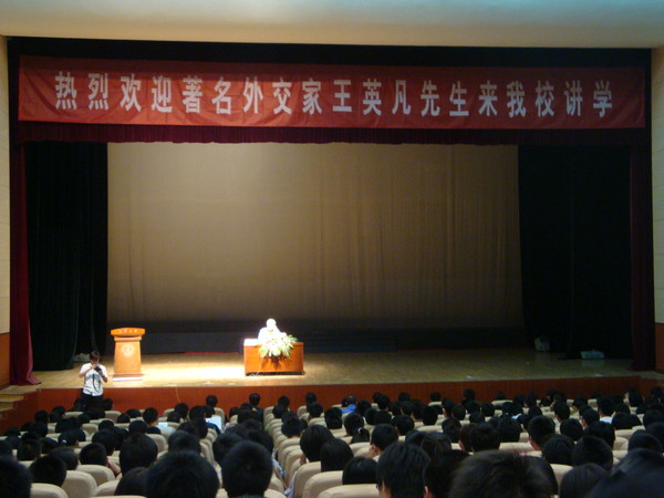 2009年5月26日晚,应我校邀请,著名外交家、前外交部副部长、中国常驻联合国代表、特命全权大使王英凡先生在渭水校区为广大师生作题为《当前国际形势的几个热点问题》的报告。