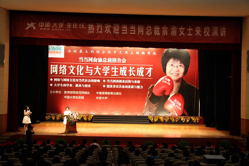 首先,俞渝女士以当当网的创业历程为案例,重点从“网络对传统商业运作模式的改变”、“对社会透明度的促进”、“独有网络文化的生成”等方面论述了网络对当前社会的影响,并强调了网络在促成简单、及时、经济的信息交流上的重要作用。当谈到“大学生就业创业”时,俞渝女士说,创业者不仅需要拥有敏锐的洞察力,寻找和组合资源的执行力,需要拥有一个具备战略性目标的团队,更需要承受挫折的能力和百折不挠的毅力。她嘱咐大学生在校期间一定要注意锻炼自己的实践能力,要做到学以致用,不能读死书。同时,她鼓励大学生先就业再创业,因为就业是创业的基础和前提,就业经验是成功创业的宝贵资源。