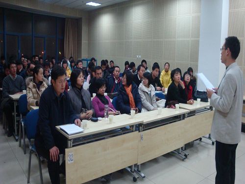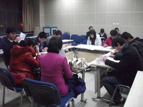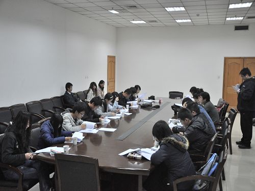 在公布了各小组评审成员名单和评审程序后小组评审正式拉开。整个小组评审分别在会议室、培训室等四个会场进行。每个小组由三位老师和六位学生代表组成评委团,组长由老师担任,副组长则从学生代表中产生,老师与学生投票效力完全相同。