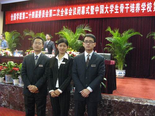 11月20日上午,全国学联第二十四届委员会第三次全体会议闭幕式暨中国大学生骨干培养学校第三期开班式在京举行。团中央书记处第一书记、中国大学生骨干培养学校校长陆昊,团中央书记处书记卢雍政,全国学联主席、中国大学生骨干培养学校副校长刘凯,团中央学校部部长、中国大学生骨干培养学校秘书长李小豹出席会议。来自全国211高校的两百余名省级学联执行主席、学生会主席和研究生会主席参加了会议。我校2008—2009学年学生会主席朱绍明、研究生会主席佘磊磊、研究生会副主席兼驻省学联执行主席许文哲参加了开班仪式。