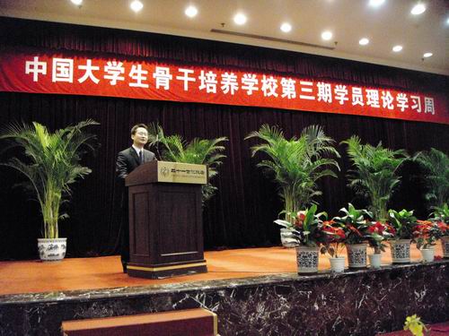 中国大学生骨干培养学校第三期学生会是中国大学生骨干培养学校第三期学员的学生自我管理、自我服务的组织。经过班级推荐,共有16名来自各高校的研究生会主席、学生会主席参加了竞选。经过激烈的演讲和现场质询环节,经全体与会人员投票表决,我校研究生会主席佘磊磊同学作为陕西“211”高校唯一代表顺利当选网络部部长一职。