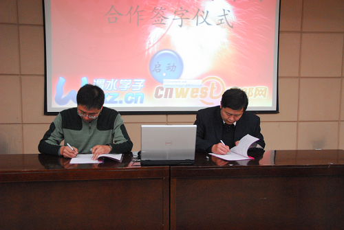 仪式上,团学新闻中心同学先向各位领导和嘉宾介绍了“渭水学子”的改版情况。随后,校团委书记张骞文和西部网采编中心主任刘晓斌签署了合作协议,并成功启动了新版渭水学子网。接着,西部网采编中心主任刘晓斌作了讲话。他详细地向大家介绍了本次合作的内容,高度赞赏了我校学生的才华,并衷心地祝愿双方能在内容共享、创意方案地共同打造和实现、网络制作团队的共同培养等方面有一个很好地合作。
