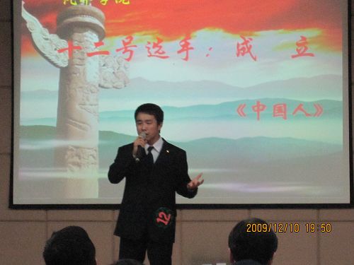 本次比赛分为主题演讲和即兴命题演讲两个环节。一首悠扬动听的《映山红》拉开本次比赛的序幕,选手们或纵观古今,或横贯中西,在对比中抒发对祖国母亲的赞美;或结合经历,或旁征博引,在生活中表达对祖国妈妈的祝福。《少年中国少年说》热切呼吁当代国之少年为国而生,为国而战;《小家 大家》明确指出每个人的命运与祖国的命运紧紧相连;《祖国颂》展开五千年文明的辉煌画卷,书写六十载征程的沧桑巨变;《祖国画卷》热情歌颂了祖国大好河山的秀美,悠久历史的灿烂和现代化建设的丰功伟绩……在即兴演讲环节,选手们根据《铭记五四》、《“莫拉克“咆哮下的浓浓两岸情》、《两弹一星的先驱:钱学森》等题目展开了精彩的演讲,充分展现了同学们机敏的才思和广博的学识。