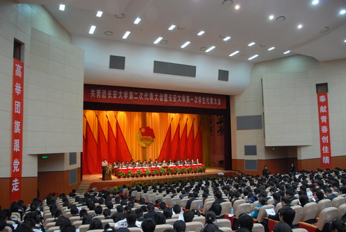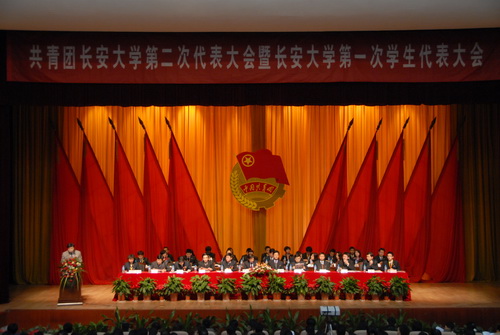 2009年12月28日上午,彩旗飘扬,花团锦簇。共青团长安大学第二次代表大会暨长安大学第一次学生代表大会在渭水校区朝晖大学生活动中心大礼堂隆重开幕。巨幅会标“共青团长安大学第二次代表大会暨长安大学第一次学生代表大会”悬挂在主席台正上方,鲜艳的红旗簇拥着团徽,主席台前盛开的鲜花映衬着代表们一张张朝气蓬勃的面孔,到处洋溢着积极向上的青春气息。团省委副书记张小平、省学联主席朱伟、团市委书记李斌、团省委学校部部长单舒平,校党委书记雷达、校长马建、校党委副书记杜向民、白华、副校长刘建朝出席大会。我校部分党政部门、直属单位和各院系领导出席大会,西安交通大学等30所兄弟院校、兄弟单位的团委书记、19所高校学生会主席也到场祝贺。共青团中央学校部、全国学联办公室向大会发来贺信。同时,北京大学、清华大学等全国70余所著名高校的团委、学生会也为大会发来了贺信、贺电。