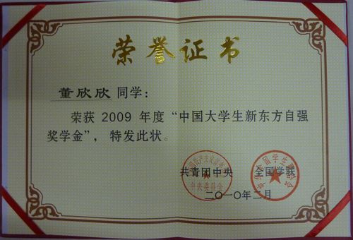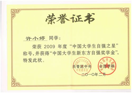 近日,从团中央传来好消息,我校经管学院会计学专业05级研究生许小婷同学被评为了2009年度“中国大学生自强之星”,并获得了“中国大学生新东方自强奖学金”5000元。同时,汽车学院物流工程专业07级董欣欣同学荣获2009年度“中国大学生自强之星”提名奖,获得奖学金2000元。