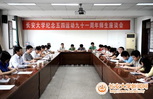 2010年5月6日下午,长安大学纪念五四运动九十一周年师生座谈会在校本部行政楼四楼会议室召开。会议以纪念五四运动,学习胡锦涛总书记给中国农业大学师生的回信和温家宝总理在北京大学的讲话为主题,深入学习探讨了新时期青年学生成长成才、建功立业的相关问题。校党委宣传部部长黎开谊、武装部部长兼学工部副部长贺宏斌、校团委书记张骞文与博士生、硕士生、本科生代表30余人参加了座谈会。会议由校团委书记张骞文主持。