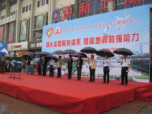 5月12日上午,在全国第二个“防灾减灾日”和汶川特大地震两周年之际,陕西省地震灾害救援志愿者服务总队成立暨授旗仪式在省体育场西门广场隆重举行。省人大常委会副主任李晓东,陕西省地震局局长胡斌,共青团陕西省委书记卫华,省文明办副主任沈卡莉,省政府应急办主任张小宁及西安市地震局、中共碑林区委、碑林区人民政府有关领导出席了仪式。我校45名青年志愿者参加了授旗仪式。仪式由省地震局姬丁义副局长主持。
