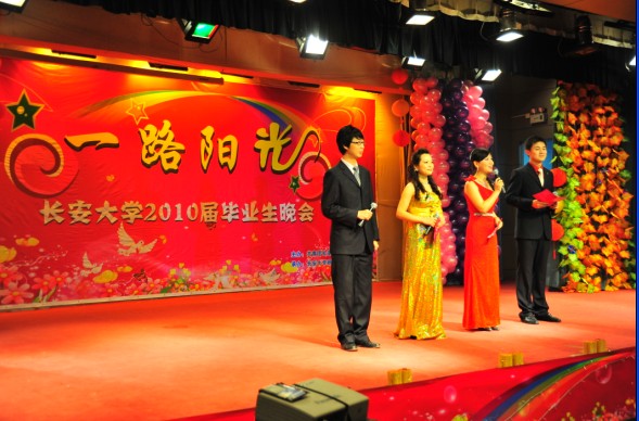 5月16日晚19:00,由共青团长安大学委员会主办,长安大学研究生会承办的2010届毕业生晚会在校本部东院雁博园四楼多功能厅隆重举行。校党委副书记白华,党委宣传部副部长曾乐元,学工部部长田新民,武装部部长兼学工部副部长贺宏斌,研究生部主任吕彭民,党校常务副校长宋美红,就业与发展服务中心副主任柴启东,团委书记张骞文,团委副书记张侠以及陕西省学联主席尚军亮同学应邀出席了晚会。参加晚会的还有各学院主管研究生工作的院领导,以及来自西安交通大学、西北工业大学等10余所高校的研究生会主席、学生会主席。我校近700名本科、研究生毕业生观看了晚会。