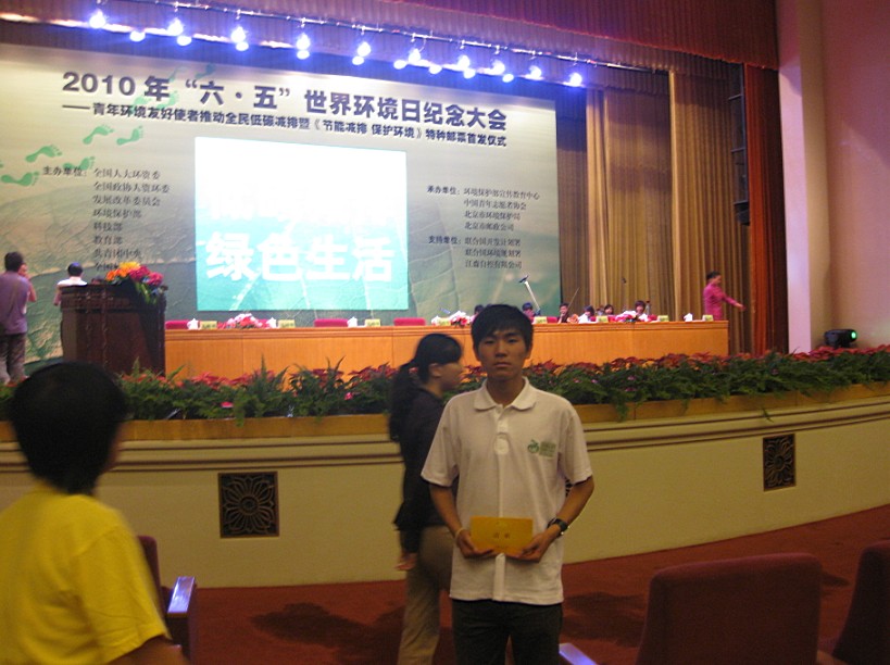 我校我校碧连天环协理事长李建宇同学,六月四日至六日应邀去北京人民大会堂参加由全国人大环资委、全国政协人资环委、发展改革委、环境保护部、科技部、教育部、共青团中央、全国妇联主办的“六.五”界环境日纪念大会暨“千名环境友好使者行动”活动。