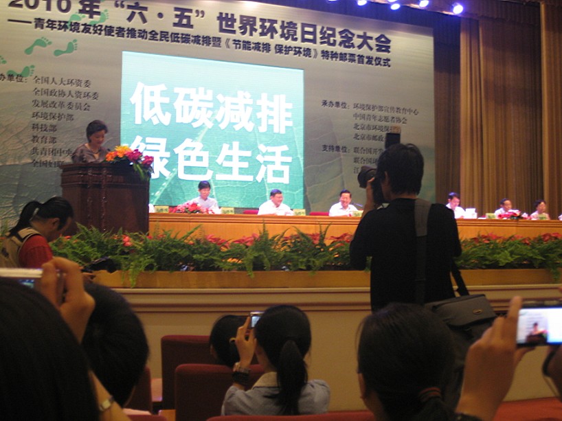 6月5日,大会中环境保护部部长周生贤,对青年环境友好使者们一年来取得的成果表示了充分的肯定,并鼓励青年做“绿色种子”,倡导低碳生活,践行绿色消费,宣传节能环保。
