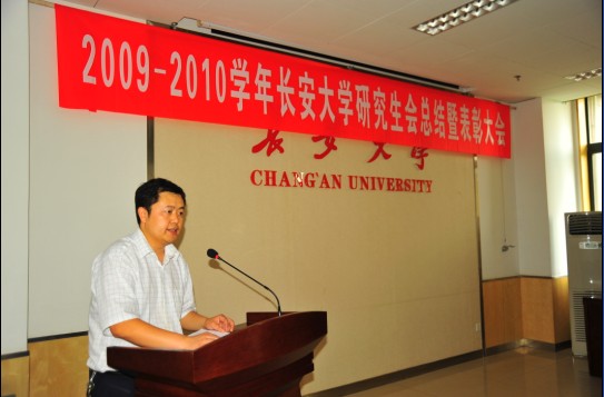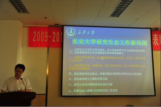 首先校研究生会主席佘磊磊同学对2009—2010学年长安大学研究生会的工作进行了总结。在题为“传承精品 锐意创新 开创研究生会工作的新局面”的研究生会工作报告中,佘主席从七个方面对校研究生会2009—2010学年的工作进行了总结:一、以研究生学术年会等为契机,努力营造浓厚学术气氛和良好学术风气,提高我校研究生学术道德意识和科研创新能力;二、积极开展内容丰富、格调高雅的校园文体活动,丰富广大研究生课余文体生活;三、创新宣传新式,加强对内、对外交流与合作,进一部深化研究生会的知名度与影响力;四、紧扣国家和社会热点,积极开展各项思想引领及社会公益活动;五、组织建设和人才梯队培养方面;六、研究生活动开展的商业运作方面;七、积极完成上级部门安排的其他工作任务。佘主席的总结条理清晰,逻辑性强,全面总结了过去一年校研究生会所做出的努力和取得的成绩,赢得了在场老师和同学的阵阵掌声。