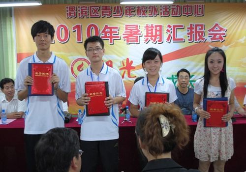 2010年8月20日上午实践队全体成员与活动中心师生在活动中心报告厅举办了渭滨区2010年暑期汇报演出,经过全体实践队员及中心主管老师精心筹划和周密准备,整台晚会获得了与会领导和广大学生家长的高度评价。晚会期间由实践队指导老师张红表演的古筝弹唱、实践队成员王瑾表演的街舞、实践队全体成员共同表演的《幸福拍手》等节目都为整台晚会增色不少,期间实践队成员黄冠同学代表本次社会实践活动全体成员发言,向支持和帮助本次实践活动开展的领导和老师表示感谢。黄冠、王瑾、田陆、李雪、范夏阳等五名同学受到活动中心的表彰。会后宝鸡市、渭滨区及活动中心主要领导与本次实践活动全体成员一同合影留念,本次社会实践活动活动在一片欢笑声中圆满结束。