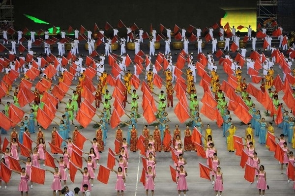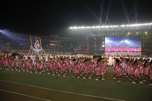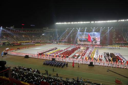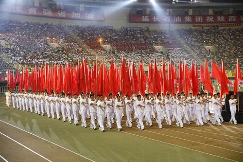 开幕式上,大型文体表演《强省富民,潮涌三秦》充分运用景、声、光、电技术,演出场面蔚为壮观,堪称一场视觉的盛宴。其中,第一篇章主要以陕北、关中、陕南这三个不同风格的地域为板块,分别展示了黄土神韵、汉水风情、秦川情怀三个不同地域的文化内涵,和我省在西部大开发中的辉煌成就和优势地域文化特色。第二篇章则以健身惠民欢乐三秦为主题,突出展现了体育“健康、快乐、和谐、进步”和“科学健身、体育惠民”的理念。第三篇章重点表达了全省人民对建设西部强省的美好期望和为之付出的不懈努力,同时也表达了全省体育战线的豪情壮志。在这一篇章中,我校550名学生参与的《红旗颂》表演气势恢宏,充分彰显了我校学生健康向上的精神风貌,赢得了观众的阵阵掌声。