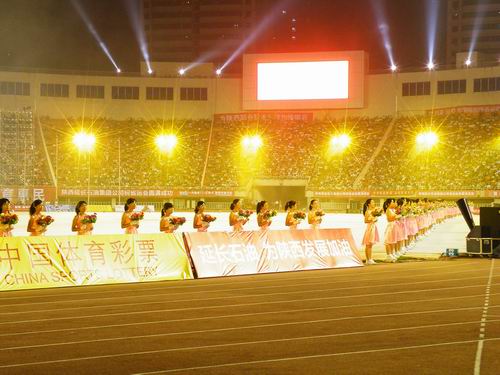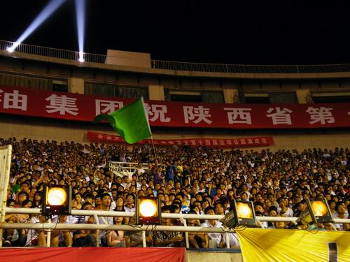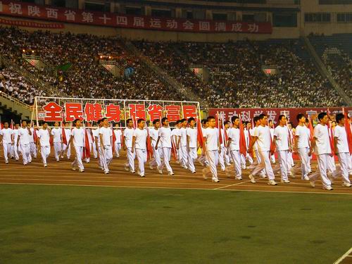 夜晚的省体育场内华灯绽放,鼓乐喧天。20时整,伴随着激昂的运动员进行曲,入场式开始。我校130名欢迎队同学率先走进场地,她们手捧鲜花,伴着激昂的乐曲欢迎各代表队的入场。随后,由我校学生组成的花束及会徽方阵、彩旗方阵紧随国旗方阵、会旗方阵入场,他们步伐整齐,精神抖擞,向全省人民展示了我校学生的良好精神面貌。最后入场的是由我校学生组成的标语方阵,“阳光体育,活力陕西”、“全民健身,强省富民”很好地诠释了本次运动会的宗旨。每当我校学生方队入场的时候,看台上的我校师生都挥舞校旗,鼓掌呐喊,“长安大学全体师生预祝陕西省第十四届运动会圆满成功”和“传奥运精神、展三秦雄风、扬学子激情”的横幅更是很好地表达了我校师生的良好祝愿。