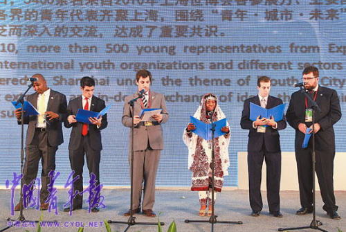 世界各大洲青年代表一起宣读2010上海世博青年倡议书。