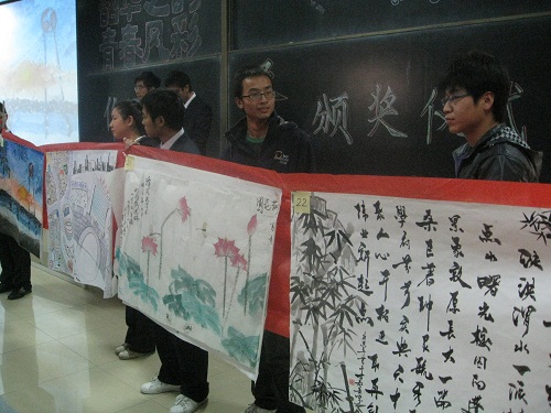九点半,评审工作正式开始。首先进行的是参赛作品展示,本次比赛参赛作品共有132幅,经初审,有89幅作品入围。参加最终评审的作品分三组,每组三十幅进行展示,参赛选手对自己的作品进行简要的解读。或红梅清荷,或校园一景的画作,或洒脱不羁,或工整俊秀的书法,一幅幅作品无不表达了同学们对六十年校庆即将来临的喜悦和祝福,赢得了评委的肯定和同学们的赞叹。接下来,评委对参赛作品进行打分。每幅作品有五位评委现场打分,并由工作人员现场汇总、计算,取平均分为选手最终得分。期间,由院大艺团带来的精彩表演赢得观众的阵阵掌声。