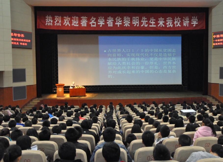 11月24日晚7:30,中国国际问题研究所特邀研究员、中国联合国协会常务理事、中国前驻伊朗、阿联酋、荷兰大使华黎明先生在我校渭水校区朝晖大学生活动中心大礼堂为我校师生做了题为《中国与世界》的报告。校团委书记张骞文出席讲座现场。校团委老师刘艳艳主持报告。