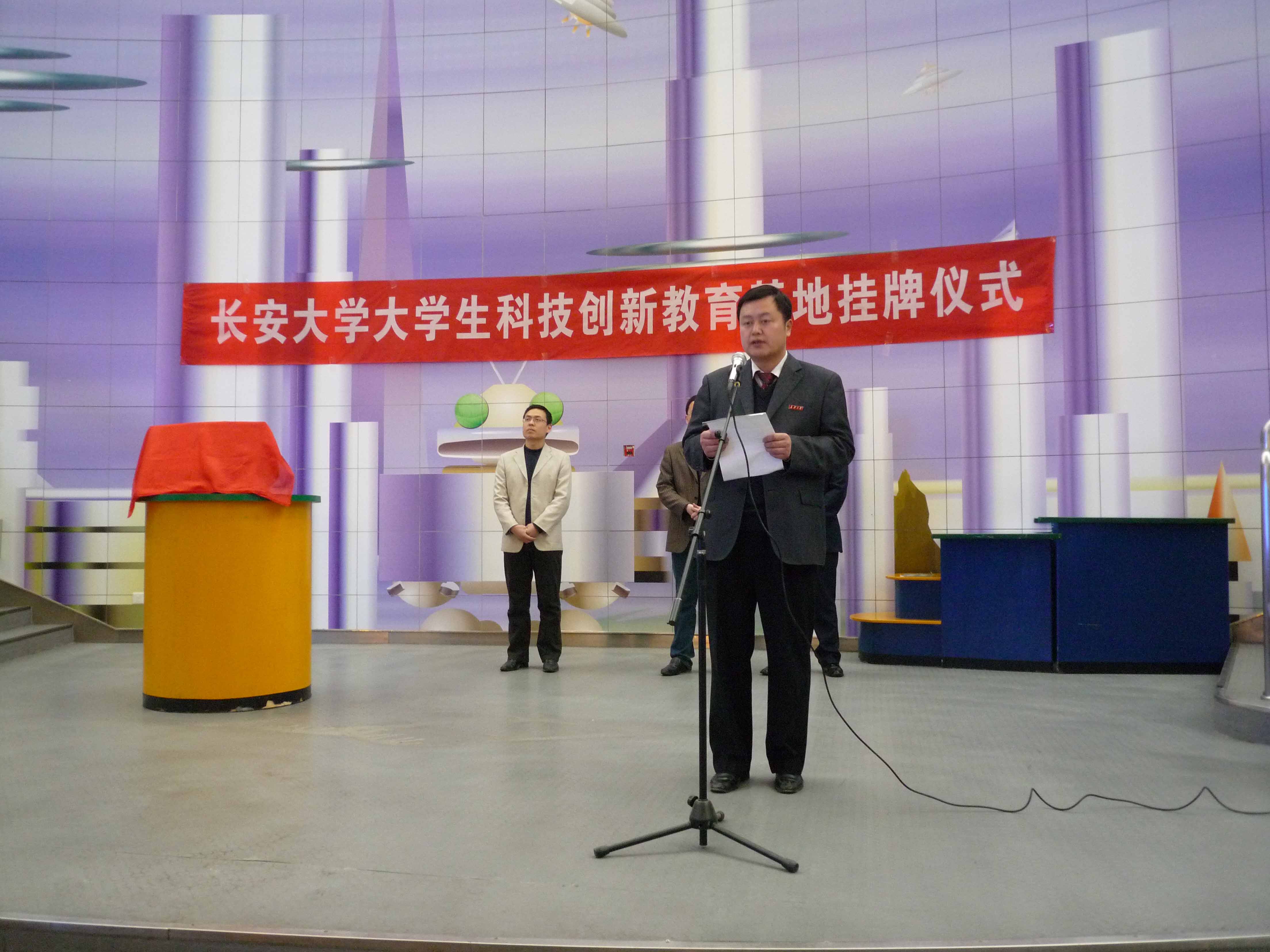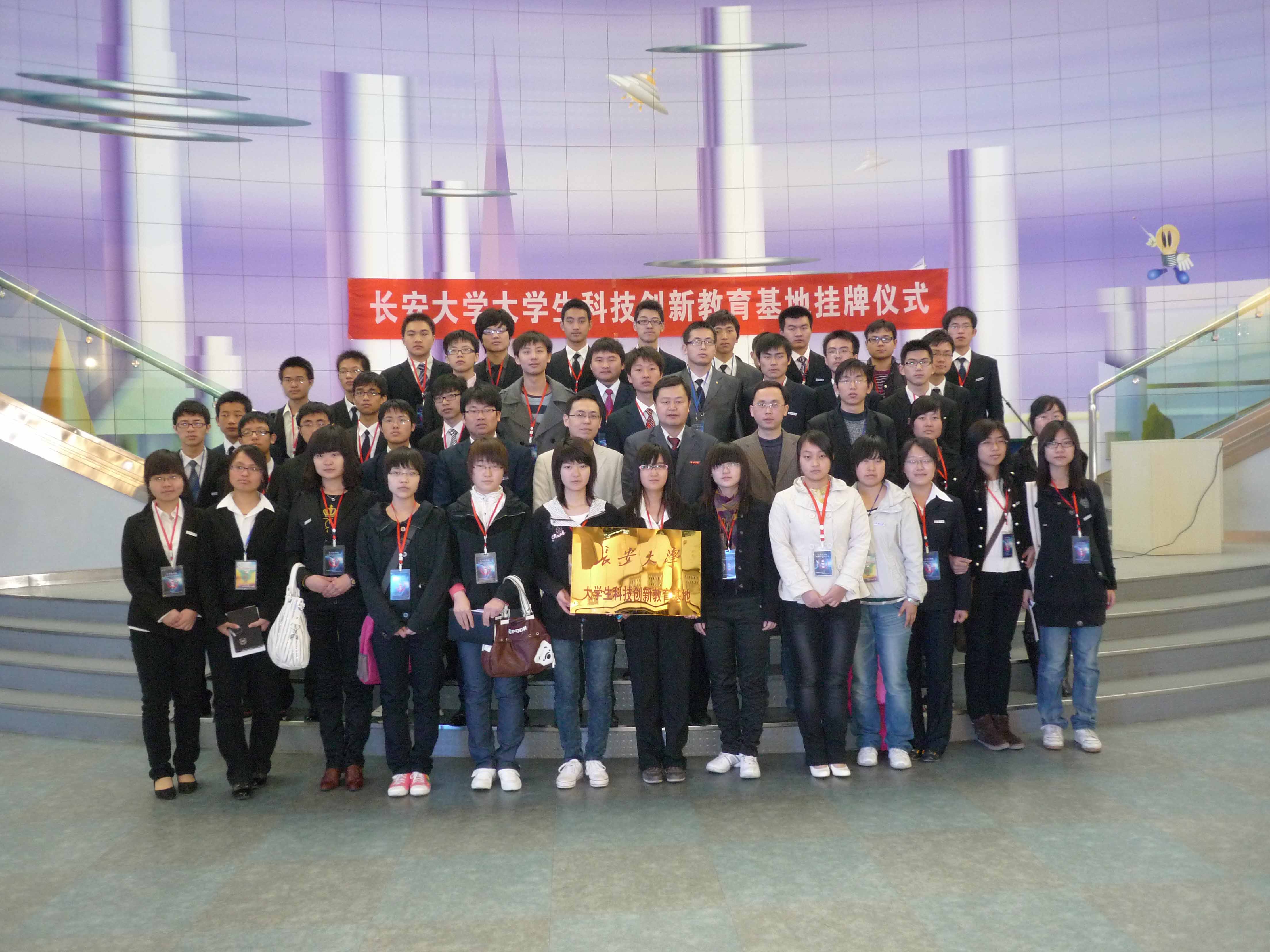 仪式最后,校团委书记张骞文和展教部部长文传富共同为长安大学大学生科技创新教育基地揭牌,并与全场同学合影留念。