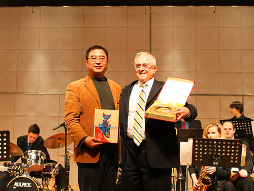 3月29日,正值长安大学60周年校庆来临之际,应学校邀请,美国BCC爵士乐团在渭水校区大学生活动中心大礼堂举办专场音乐会,为长安大学送上了一份厚礼。此场音乐会由校国际合作处和校团委主办,由学生社团联合会承办。学工部、校团委领导以及学校部分老师、学生近一千五百人观看了音乐会。在音乐会开始前,由校团委书记张骞文陪同美国BCC爵士乐团参观了我校校史馆。 BCC爵士乐团创立于1970年,20年来,在美国西北地区,演出水平无人能及。他们多次在各种爵士嘉年华中夺冠或表现优异。由BCC每年主办的国际嘉年华,已成为全美最受欢迎的嘉年华之一。另外,BCC爵士乐团指挥Hal Sherman是爵士乐界最有经验的教育家之一,具有40年的教学经历。 晚7:30,伴随着悠扬的音乐,帷幕缓缓拉开,音乐会正式开始。首先,长安大学学工部部长田新民与美国BCC爵士乐团指挥Hal Sherman互赠礼物,希望双方友谊地久天长。为尽地主之谊,我校学生代表于忱忱演奏了二胡曲目《茉莉花》,赢得了全场热烈掌声。接下来,美国BCC爵士乐团为大家带来了激情澎湃,震撼人心的爵士乐,其中包括《STREET OF DREAM》、《芭芭拉之歌》、《WHAT IS CALLED》等歌曲。在这期间,乐团指挥Hal Sherman风趣幽默的讲话赢得了阵阵掌声和笑声,而他和女主持不时的互动更是让全场的氛围变得轻松愉快。随后,长安大学校学生会主席王垚代表全场观众预祝Hal Sherman先生81岁生日快乐并赠送礼物。Hal Sherman 先生收到礼物后非常激动,他非常感谢长安大学热情周到的组织和服务工作,并表示能来长安大学举办音乐会是他的荣幸,并祝愿长安大学越办越好!最后,由我校教师代表吴鹏演唱了咏叹调《今夜无人入睡》,现场气氛再一次达到高潮。9:30,音乐会圆满结束。 此次活动是学校60周年校庆月校园文化活动之一,既促进了双方的文化交流,又丰富了学生们的课余生活,更为即将到来的校庆营造了喜庆、隆重、热烈的氛围!我们相信,在全校师生的共同努力下,长安大学一定会迎来崭新的明天,再创华丽新章篇!