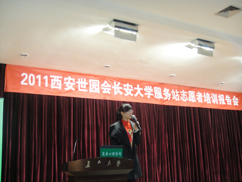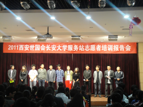 为了使服务西安世园会的志愿者全面准确地掌握工作流程,并熟练运用园区志愿者所需的知识与技能,2011年4月10日下午2:00,2011西安世园会长安大学服务站志愿者培训报告会在渭水校区朝晖大学生活动中心三楼多功能厅举行。我校500名志愿者参加了培训。