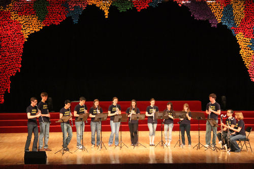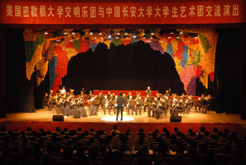 应马建校长邀请,美国密歇根大学管乐团近日来我校进行交流访问。5月18日上午,渭水校区朝晖大学生活动中心大礼堂人声鼎沸,掌声如潮,美国密歇根大学管乐团与我校大学生艺术团交流演出活动在这里隆重举行。美国密歇根大学常务副教务长Lester P. Monts教授、我校校长马建、副校长刘伯权、校党委副书记白华等领导出席活动。学校有关部门负责人、近千名师生代表观看演出。 演出开始前,马建校长与美国密歇根大学常务副教务长Lester P. Monts教授互赠纪念品并合影留念。 刘伯权副校长致欢迎辞。他代表我校向应邀来访的美国密歇根大学管乐团师生表示热烈的欢迎,更对美国密歇根大学常务副教务长Lester P. Monts教授两年来三次访问我校表示由衷的感谢。刘伯权副校长指出,通过本次访问,密歇根大学与我校达成了更多关于学生交换的合作协议,今后两所大学间的友好关系将向更加深远的方向发展。 演出在美国密歇根大学管乐团演奏的清脆动听的交响乐中拉开帷幕。密歇根大学管乐团的同学们倾情演奏了《Parade “xuan”》、《 New York Counterpoint》、《Aria and Dance》、《Fantasia Brasileira》、《Bassooner or Later》、《Speed Metal Organum Blues》等一首首或轻快,或浑厚,或喜悦的曲目,使现场的观众领略了西方音乐的魅力。我校大学生艺术团则精心准备了独具中国民族特色的节目,用古筝与打击乐演奏的《欢庆锣鼓》,打击乐器的宏伟壮阔与古筝的轻快灵动交相辉映,演奏出一派欢乐喜庆;手风琴演奏陕北民歌《赶牲灵》,奏出了陕北高原的风土人情;融合民族传统音乐与经典流行元素合为一体的蒙古族音乐《赛马》,更是以二胡四重奏的形式将中国传统音乐的魅力尽现于观众面前。同时,大学生艺术团演奏的《拉德斯基进行曲》、《欢迎进行曲》、《喜悦组曲第一乐章》和《康康舞曲》等乐曲也为密歇根大学管乐团的师生留下了深刻印象,引来了他们一次又一次热烈的掌声。 音乐,是全球共享的语言艺术;音乐,是中西方交流的文化纽带。美国密歇根大学管乐团与我校大学生艺术团交流演出为我们献上了一场华丽曼妙的视听盛宴,给生机勃勃的渭水校区注入了新的活力。 中西文化交流,感悟音乐之美。美国密歇根大学管乐团与我校大学生艺术团交流演出活动在热烈的掌声中圆满落下帷幕。
