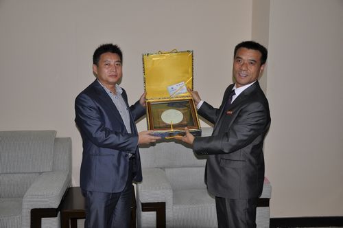校党委副书记、纪委书记孟德勇向陕西省戏剧家协会副主席、陕西省艺术研究所所长丁克明赠送纪念品