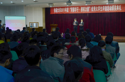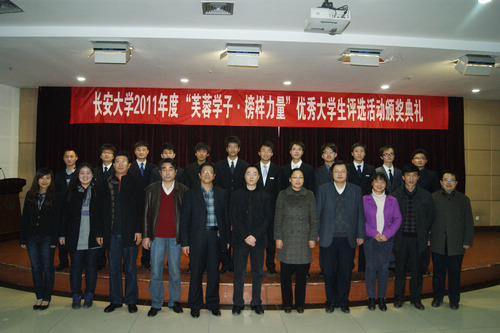2011年12月15日下午,长安大学2011年度“芙蓉学子•榜样力量”优秀大学生评选活动颁奖典礼在渭水校区朝晖大学生活动中心三楼多功能厅隆重举行。校长助理彪晓红,湖南中烟工业有限公司代表王鹏,学工部部长贺宏斌、校团委书记张骞文、副书记张侠、渭水校区管委会办公室副主任王振山、汽车学院党委副书记张增社、经管学院党委副书记张建斌、信息学院党委副书记杨玉龙等领导出席颁奖典礼。校团委全体团干部、“芙蓉学子•榜样力量”优秀大学生评选活动候选人、各校级学生组织负责人、部分学生代表参加了颁奖典礼。