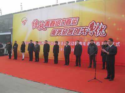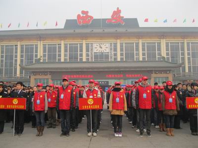 1月8日春运首日,我校80名大学生铁路春运青年志愿者在西安火车站正式上岗服务。上岗当日,西安铁路局团委在西安火车站广场举办“绽放青春给力春运、服务旅客创先争优——春运青年立功竞赛活动及青年志愿者上岗仪式”。 共青团陕西省委书记李豫琦、西安铁路局党委书记陆海霞、我校团委书记张骞文等出席仪式。