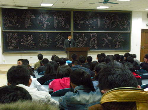 2012年3月30日晚7时,经管学院在图书馆1101教室召开本学期第一次全体学生干部大会。学院院党委书记胡予欣、党委副书记张建斌、党委副书记吴喜梅、学办主任李宏伟、团委书记李小茹和全体学办老师以及全体学生干部出席了本次会议。会议由学办主任李宏伟主持。