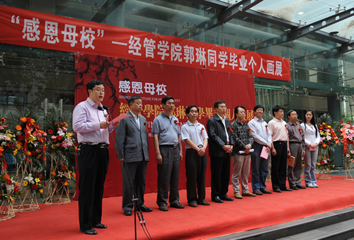 经管学院党委书记胡予欣在开幕式上讲话。他说,郭琳同学在校期间表现突出,德智体美全面发展,是经管学院众多优秀学生中的一个突出典型。郭琳同学举办以“感恩母校”为主题的毕业个人画展,体现了她强烈的感恩意识和对母校的深爱,是对母校、学院、老师和同学的回馈,也是对自己未来人生和艺术之路的激励。