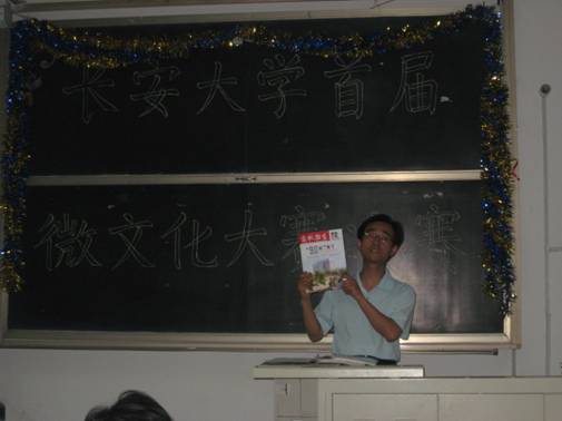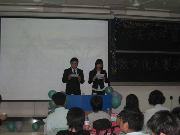 2012年5月28日19:00,由长安大学招生办、校团委主办,微博协会、环境科学与工程学院科协、社团联合会、工会文学协会协办的长安大学首届微文化大赛决赛在WX4104成功举办。长安大学招生办主任丁珊、校团委副书记张侠、环工学院党委副书记马明芳、文传学院副教授霍忠义出席本次大赛,并担任嘉宾评委。共有来自长安大学不同学院的30余支参赛队入围本次决赛。