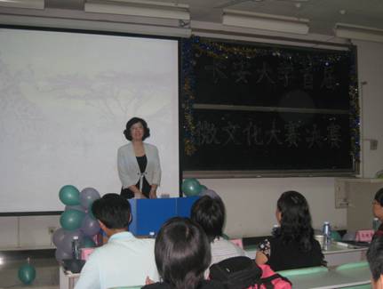 大赛开始后,首先由招生办主任丁珊老师为大赛致辞。丁老师介绍了长安大学的发展历史,强调了本次微文化大赛的重要性,并预祝大赛圆满成功。