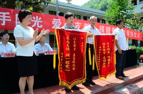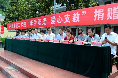 7月13日 早10时,长安大学“牵手阳光 爱心支教”捐赠暨结对帮扶仪式在商洛市镇安县结子中学隆重举行。出席本次仪式的领导老师有长安大学建工学院党委书记刘青云,公路学院党委书记田新民,离退休处党委书记李养锐,学生创新创业教育委员会办公室主任郭军杰,建工学院党委副书记李险峰,校团委社会实践指导部主任郑玮华,建工学院学办主任陈德育,建工学院团委书记王树莹,以及镇安县委常委、统战部部长李娉,镇安县教育局副局长石则健,镇安县永乐镇副镇长刘华等出席仪式。仪式由镇安县教育局副局长王铭惠主持。