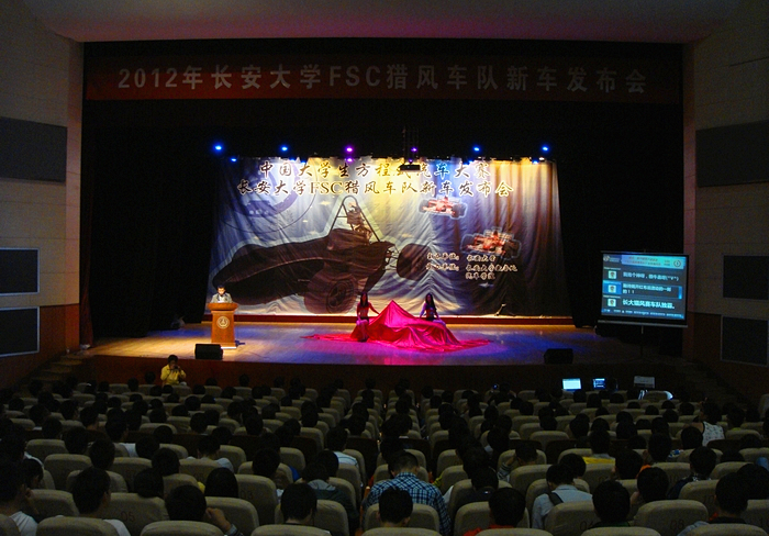 2012年10月9日下午,长安大学FSC猎风车队新车发布会在我校渭水校区大学生活动中心礼堂隆重召开。出席此次发布会的领导有长安大学学工部副部长王冰、教务处副处长魏奕、学生创新创业教育委员会办公室主任郭军杰、汽车学院党委副书记张增社、副院长袁伟,车队指导教师蔡红民、汽车学院学办辅导员、学生代表300多人参加了发布会。发布会由汽车学院党委副书记李晓阳主持。