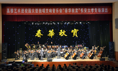 为喜迎党的十八大胜利召开,实施陕西省文化惠民工程,应我校邀请,11月5日晚,陕西省歌舞剧院高雅艺术进校园大型独唱交响音乐会“春华秋实”长安大学专场演出在渭水校区朝晖大学生活动中心大礼堂举行。副校长刘伯权、谢军占、陕西省歌舞剧院副院长仵晓岚出席活动,校团委等单位负责人及我校千余名师生代表观看音乐会。