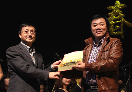 音乐会开始前,副校长刘伯权代表学校向陕西省歌舞剧院赠送纪念品。我校学生会主席李致中同学代表全体学生致欢迎辞。