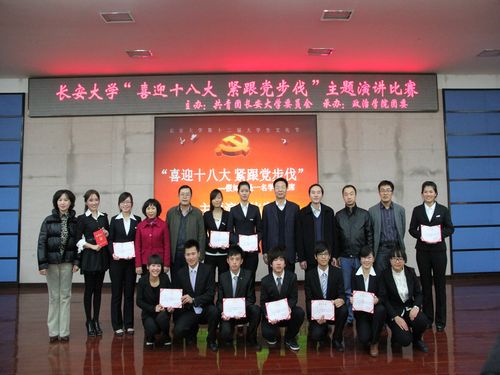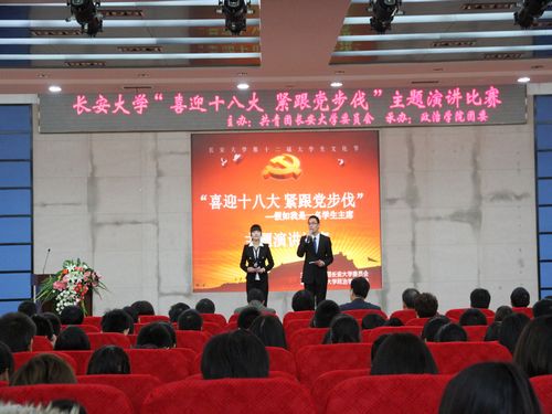 在党的十八大胜利召开之际, 2012 年 11 月 7 日晚 7:00,由共青团长安大学委员会主办,政治学院团委承办的长安大学第十二届大学生文化节之"喜迎十八大,紧跟党步伐"主题演讲比赛决赛在渭水校区会议中心二楼报告厅成功举办。校机关党委书记董洁、校团委书记张骞文、政治学院党委书记王景荣、校学工部副部长王冰、渭水校区办副主任邱旭辉出席活动并担任评委,校学工部部长贺宏斌、政治学院党委副书记宋琳、校团委副书记张永也莅临现场。校院两级团学组织的负责同学以及校青马高级班骨干学员同来自政治学院、资源学院等院系500余名同学参加了活动。