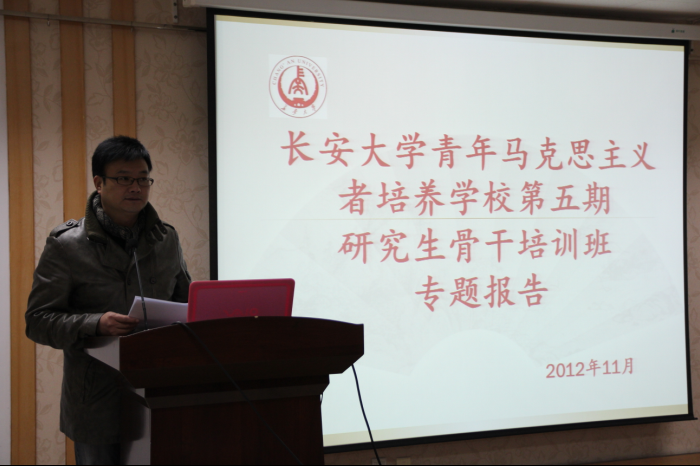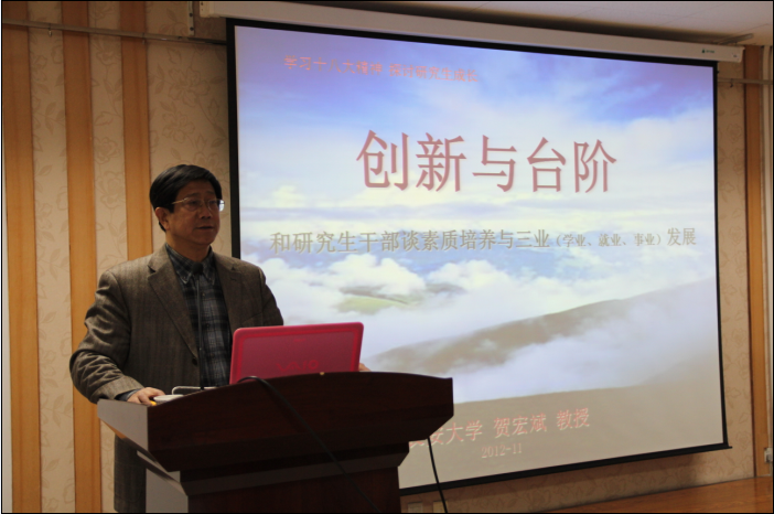11月12日晚19:00,我校第五期“青马”研究生骨干班主题报告会在雁塔校区地学科技大厦第一学术报告厅成功举办。校学工部部长贺宏斌教授担任主讲,做了题为“创新与台阶-和研究生谈干部素质培养”的主题报告、“青马”研究生骨干班全体学员参加了本场报告会。报告会由学工部副部长,“青马”研究生骨干班的班主任王卫老师主持。