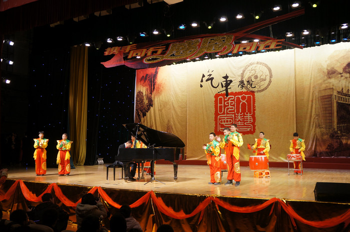 随后汽车学院2012“携手同行 感恩同在”文艺晚会在盛大的开场舞《盛世惊鸿》中拉开了帷幕。华丽的舞台,如梦如幻的舞蹈,博得了在场观众的阵阵掌声。之后,悠扬的小提琴联奏向我们展示了高雅的音乐,也展现了我们汽院学子的非凡风采。而南宽坪小学的小朋友们带来的手语表演《感恩的心》以及荆棘鸟智障儿童阳光中心的孩子所带来的表演《黄河》更是震撼了全场,将本场晚会推向了高潮。孩子们用她们的肢体语言表达了她们对支教学生的感谢,荆棘鸟的孩子则用他们的演奏表达了对社会的感谢。他们的表演为此次晚会增加了一份感人的色彩。晚会上,荧光舞和歌舞串烧等节目,以其非凡的创意,精湛的表演赢得了同学们的掌声与喝彩。此次晚会在最后一曲歌舞《我爱你中国》后画上了完美的句号。