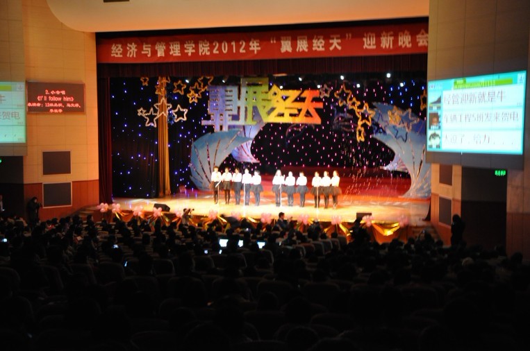 2012年12月2日晚7点整,经济与管理学院“翼展经天”迎新晚会在渭水校区朝晖大学生活动中心隆重举行。出席本次晚会的领导和嘉宾有学工部部长贺宏斌老师、渭水校区实验中心主任张雷老师,经济与管理学院党委书记胡予欣老师、院长吴群琪老师、院党委副书记张建斌老师、院党委副书记吴喜梅老师、院党委委员、实验中心主任任科社老师、会计系主任云虹老师、财务管理系主任丁岳维老师、信息管理与信息系统系主任王炼老师、统计系主任左庆乐老师、学院办公室主任王菁老师、学院学生工作办公室主任李宏伟老师。出席本次晚会的还有各行政职能部门及各兄弟学院的老师们。我院渭水校区1000多学生观看了晚会。