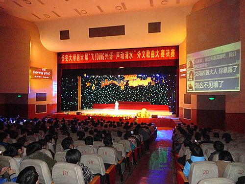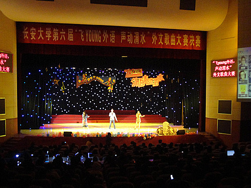 由校团委主办,外语学院承办的长安大学第六届“飞YOUNG外语 声动渭水”外文歌曲大赛12月7日晚在渭水校区大学生活动中心礼堂成功举办。校团委副书记张永,外语学院党委副书记路志军、团委书记宁育国,地测学院学办主任潘迎、辅导员凌海兰,建工学院学办殷佳,外语学院外籍教师Miss Gadd等出席大赛。参加决赛的11名选手是从126名选手中经过初赛、复赛最终脱颖而出的。