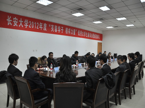 2012年12月27日晚19:30,长安大学2012年“芙蓉学子•榜样力量”优秀大学生座谈会暨颁奖仪式在渭水校区朝晖大学生活动中心一楼会议室顺利举行。校团委书记张骞文、学工部副部长王冰、公路学院党委副书记雷显峰、汽车学院党委副书记李晓阳、机械学院党委副书记曾力、经管学院党委副书记吴喜梅、建筑学院党委副书记史少鹏出席本次座谈会,校团委干部及14名(个)获奖个人(团队)参加座谈会,座谈会由校团委社会实践部主任郑玮华主持。