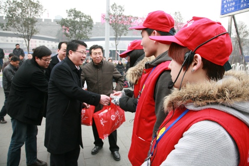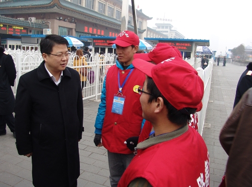 我校已连续四年配合承接西安铁路春运志愿服务工作,自1月26日春运启动以来,我校80名青年志愿者在西安火车站通过乘车指引、秩序维护、人群疏导、信息传递、照顾老弱病残旅客等多种志愿服务形式向来往的旅客们送去了温暖,用自己的出色表现赢得了西安铁路局领导及广大旅客的广泛赞誉,受到了新闻联播、新浪网等各大媒体的关注。2月6日上午,陕西省省长娄勤俭到火车站检查2013年春运工作,特地到自动取(售)票机处关注我校铁路春运志愿者服务旅客购票情况。