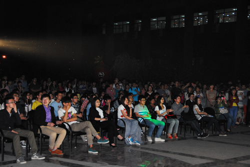 4月26日晚,夜幕下的渭水校区树蕙园广场流光溢彩,群星荟萃。为贯彻落实党的十八大和省第十二次党代会精神,凝聚实现“中国梦”的精神力量,为雅安地震抗震救灾祈福,陕西省音乐家协会系列公益文化惠民演出活动走进我校,举行“好歌唱三秦”为雅安祈福专场演出。校团委书记张骞文、副书记张永出席活动,近千名师生在树蕙园广场观看了演出。