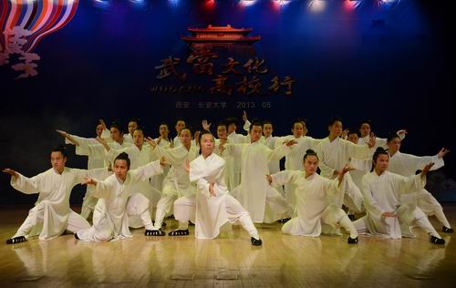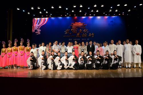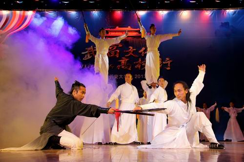 天下太极出武当,博展英姿傲群雄。此次演出汇集了武当弟子、传人精英和余理庭、余荣华、陈亚琼、董瑞等十几位世界级太极拳等传统武术冠军。中国武当功夫艺术团将武当功夫融入艺术元素在舞台上演绎,赋予了传统文化新的艺术价值和内涵。《清风明月》、《武林风》、《八卦掌》等武术节目展现了出神入化的高超功夫,以行云流水的表演,把享誉武术界的“尚意不尚力,四两拨千斤,以静制动,以柔克刚,后发制人”的武当武术思想演绎得淋漓尽致。精妙绝伦的《茶道》融合武当文化与舞蹈表演,独具韵味。特技表演《吊桶》将当晚的演出推向高潮。我校武术协会也登台表演武术节目《天降神兵》,展现长大学子风姿,展示了我校特色社团文化。在武术节目《天下太极出武当》的表演中,此次武当文化高校行长安大学之旅圆满落幕。