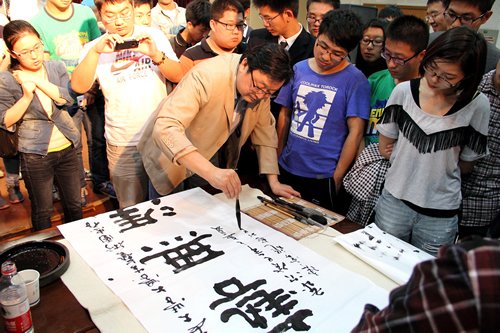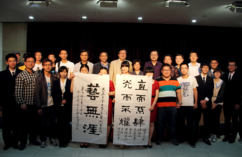 讲座结束后,陈云龙教授现场挥毫泼墨,为我校大学生艺术和社团联合会分别题字“艺无涯“、“直而不肆、光而不耀”,寄予厚望,期望学生组织、学生社团在今后工作中增加文化内涵,提升文化品位,创造出辉煌业绩。