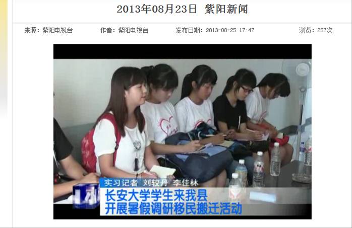 其中,入选“青年中国行”2013年暑期社会实践团队——陕南移民调研团队于 8月17日 启程奔赴陕南安康、汉中、商洛三市,展开对移民户生活质量的调研。以实地走访、调查问卷、蹲点体验等调研方式,深入了解移民搬迁前后的生产生活变化、就业情况、子女受教育情况、生产生活现状及遇到的问题等,获得了当地政府、相关机构及市民的大力支持,形成了近5万字调研报告。 期间 ,《紫阳新闻》等媒体进行了跟踪报道。