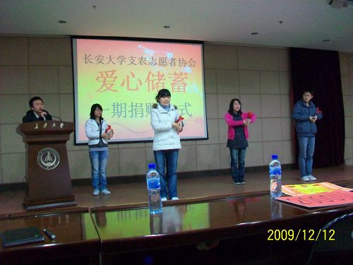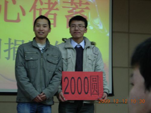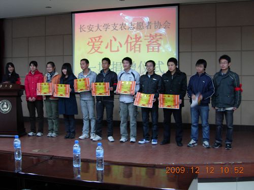 2009年12月12日上午十点,支农志愿者协会在大学生活动中心三楼举行了“爱心储蓄”的一期捐赠仪式,把2000元捐款交到了接受捐赠的代表手中。