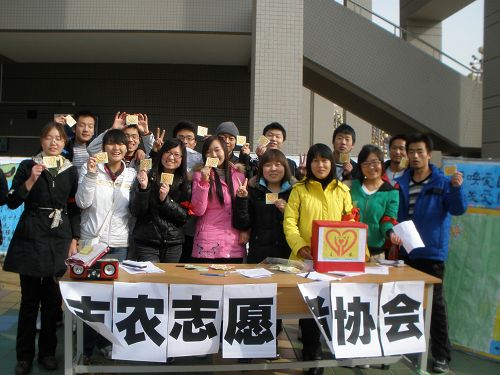 12月11日中午,支农志愿者协会在东西区食堂广场门口进行了“爱心储蓄”标志发放的活动。